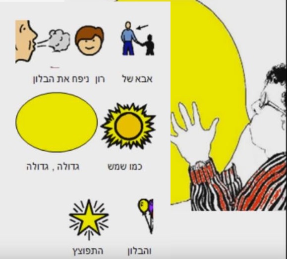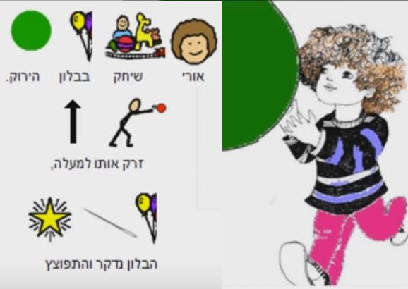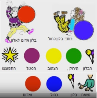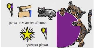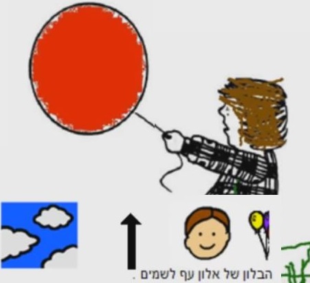 Такую замечательную систему изучения содержания детских книжек я часто встречала в виртуальных альбомах испано-говорящих учителей. Оказывается и в израильских школах есть пример использования пиктограмм для составления схемы рассказа. Эта система помогает самостоятельно пересказывать текст, опираясь на картинки-подсказки. Ученики школы "Идуд (עידוד)" нарисовали и раскрасили иллюстрации для маленького стихотворения "Приключение пяти воздушных шариков".