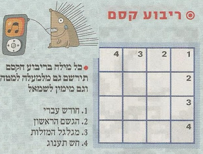 Разнообразим наши занятия по изучению иврита вырезками из израильских газет. Кажую неделю есть такие детские странички во многих изданиях. Кто уже умеет хорошо читать и знает большое количество слов из разных тем, попробуйте самостоятельно заполнить табличку 4х4. Прочитайте сначала все четыре строчки с вопросами, а потом впишите ответ в каждую строчку. Не забывайте, что мы пишем справа налево!