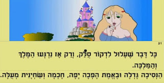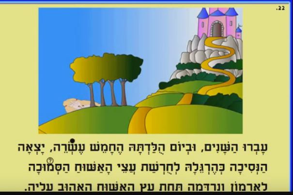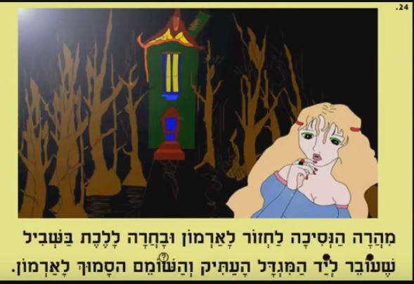 Прошли годы. В пятнадцатый день рождения вышла принцесса, как обычно, в еловую (אשוח) рощу (חורשה), прилегающую (סמוכה) ко дворцу, и задремала там под любимой (אהוב) елкой (אשוח).