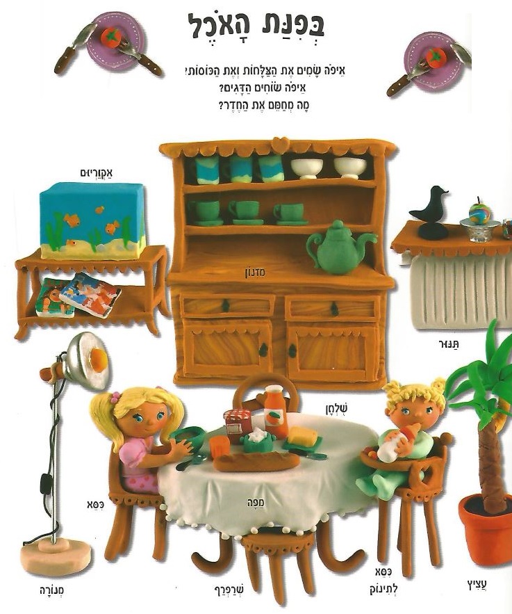 Мебель: буфет (מזנון), стол (שולחן), стул (כסא), стул для младенца (כסא לתינוק), табуретка (שרפרף).